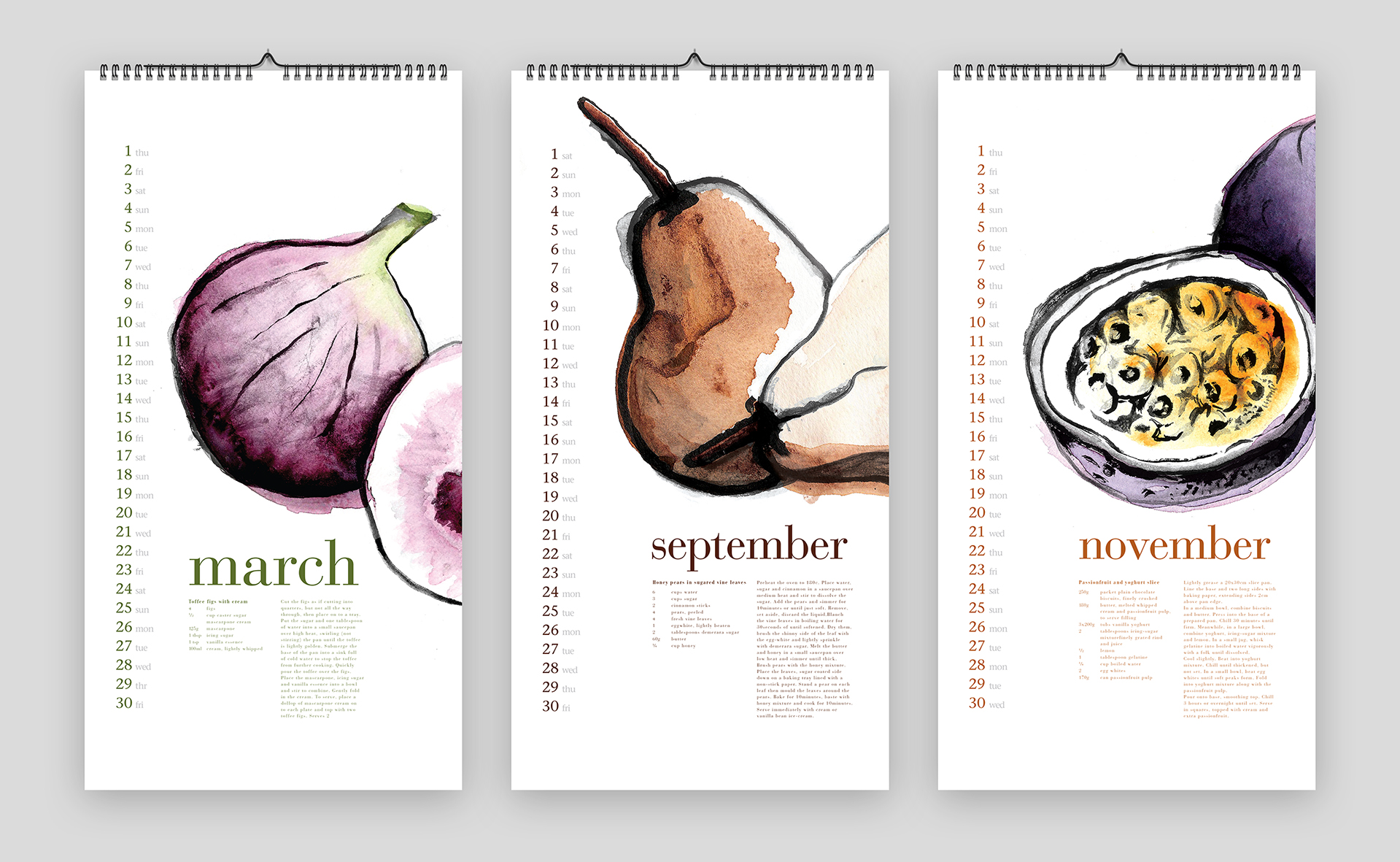 Calendar A selection of watercolour illustrations which were used for a fruit themed calendar. Illustration Hide Content
