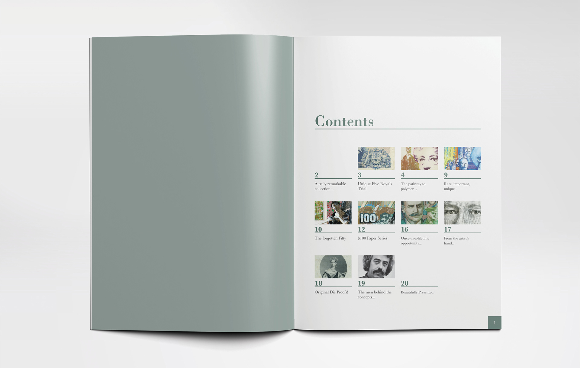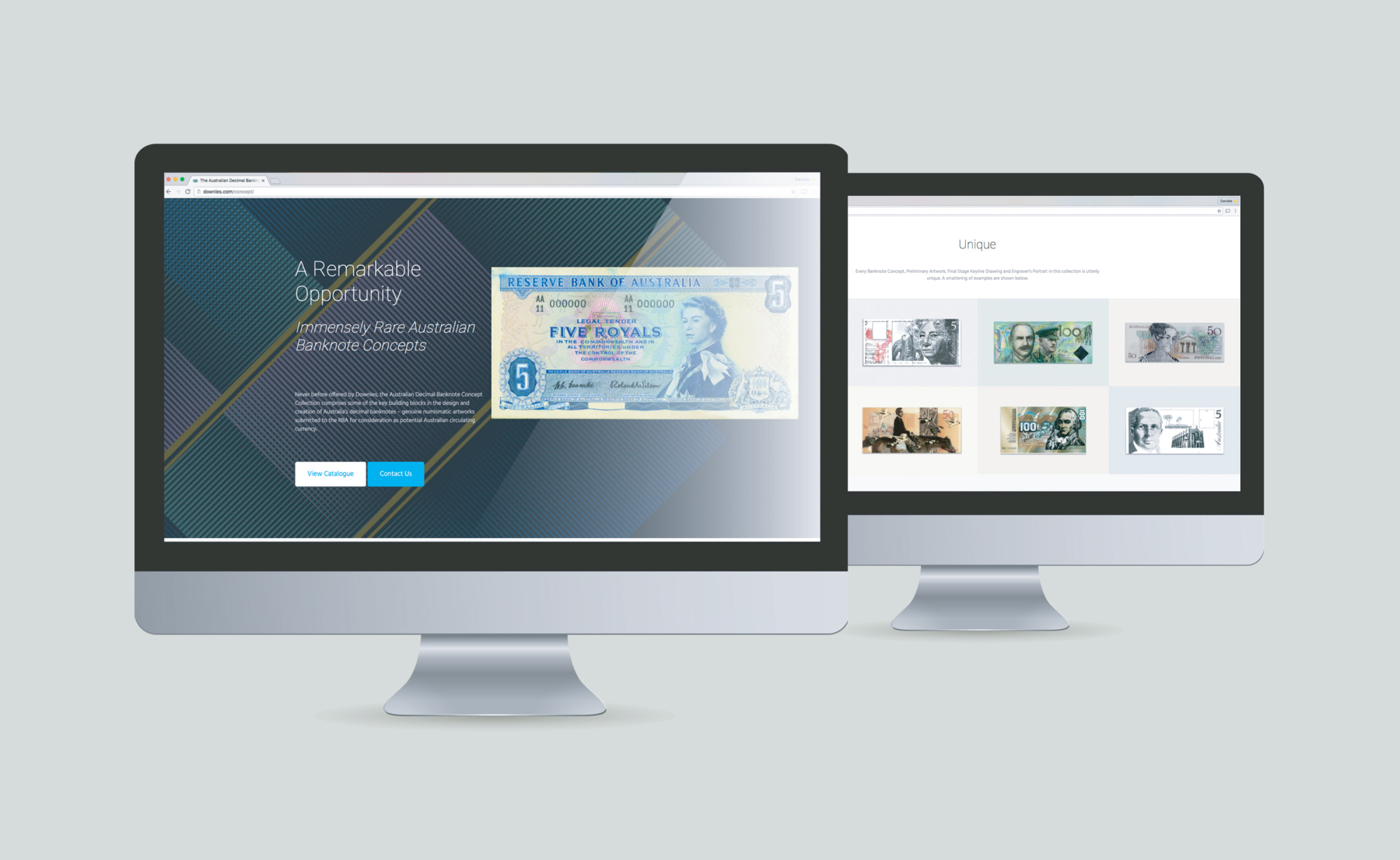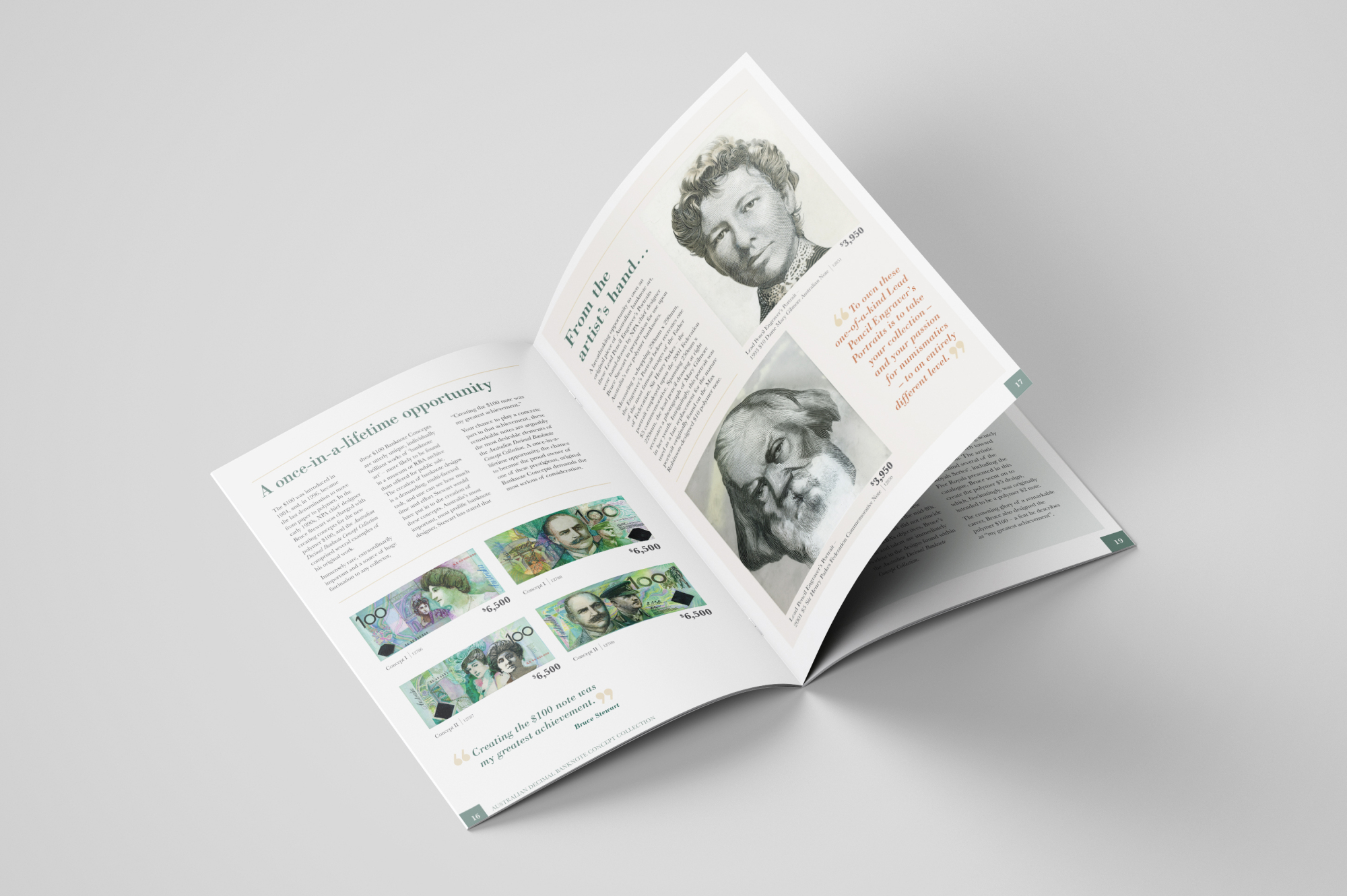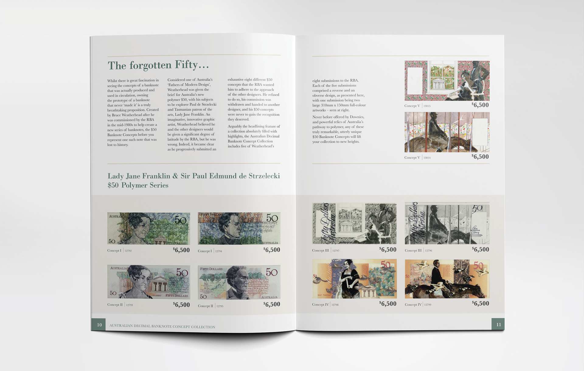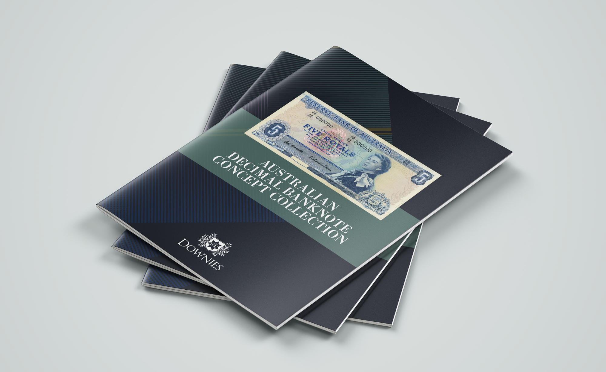 Downies Coins Australian Banknote Concept Collection Booklet Downies Coins catalogue design for concept drawings for Australian currency notes. Cover finish in matt laminate with a spot gloss. Hide Content