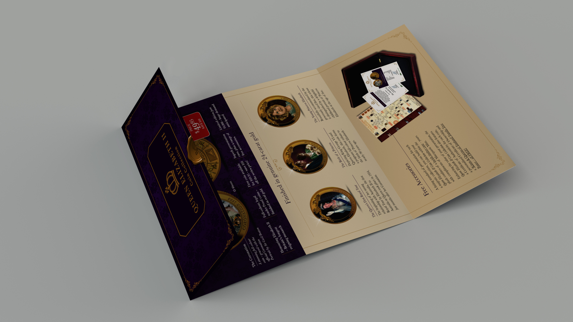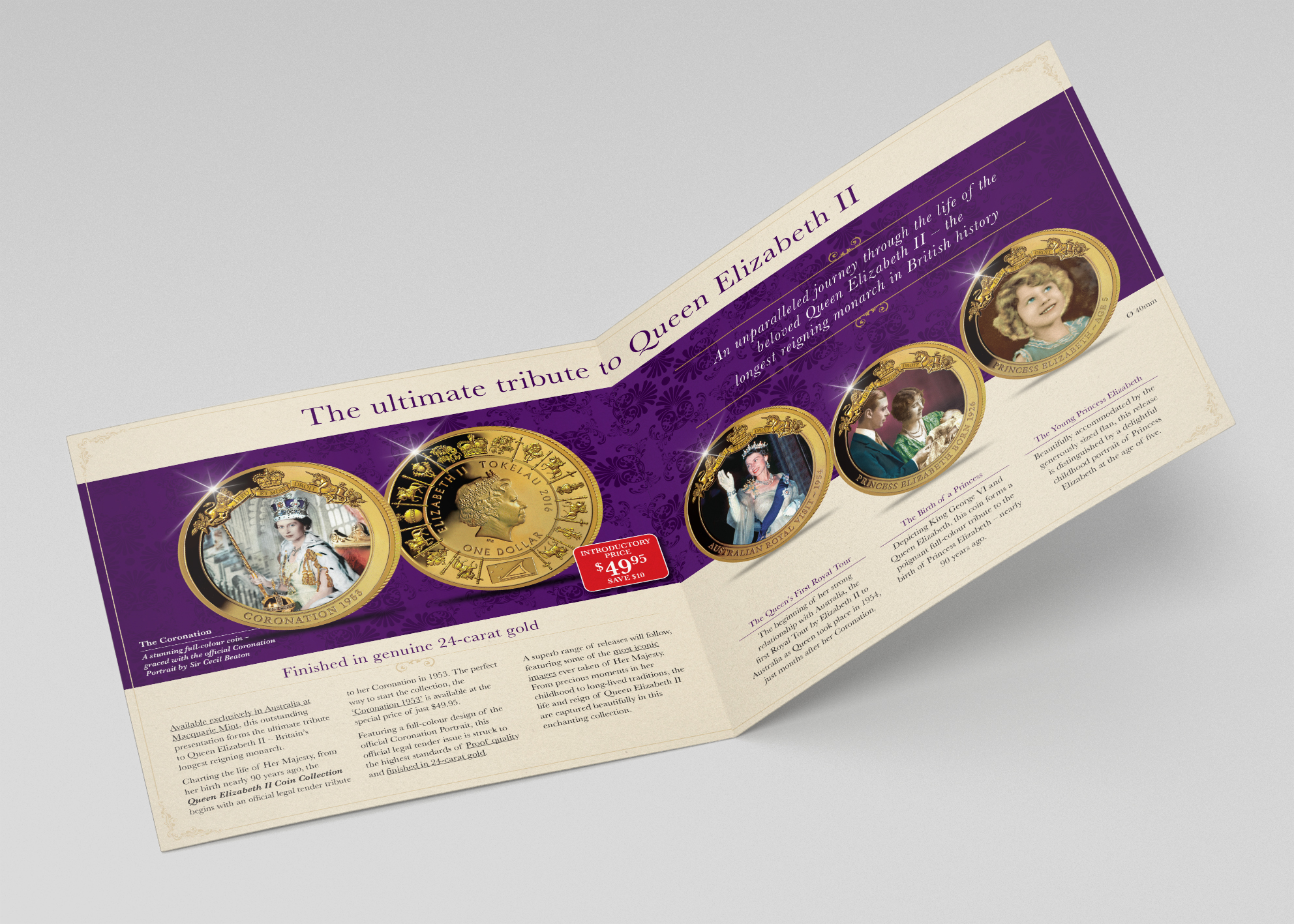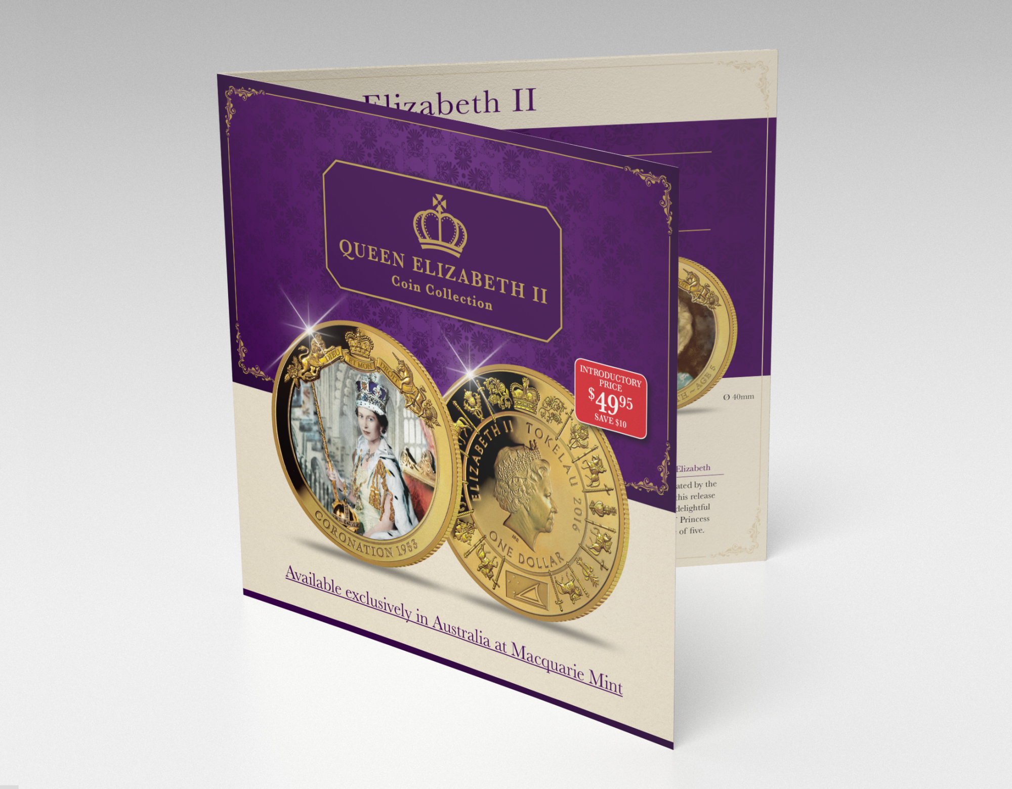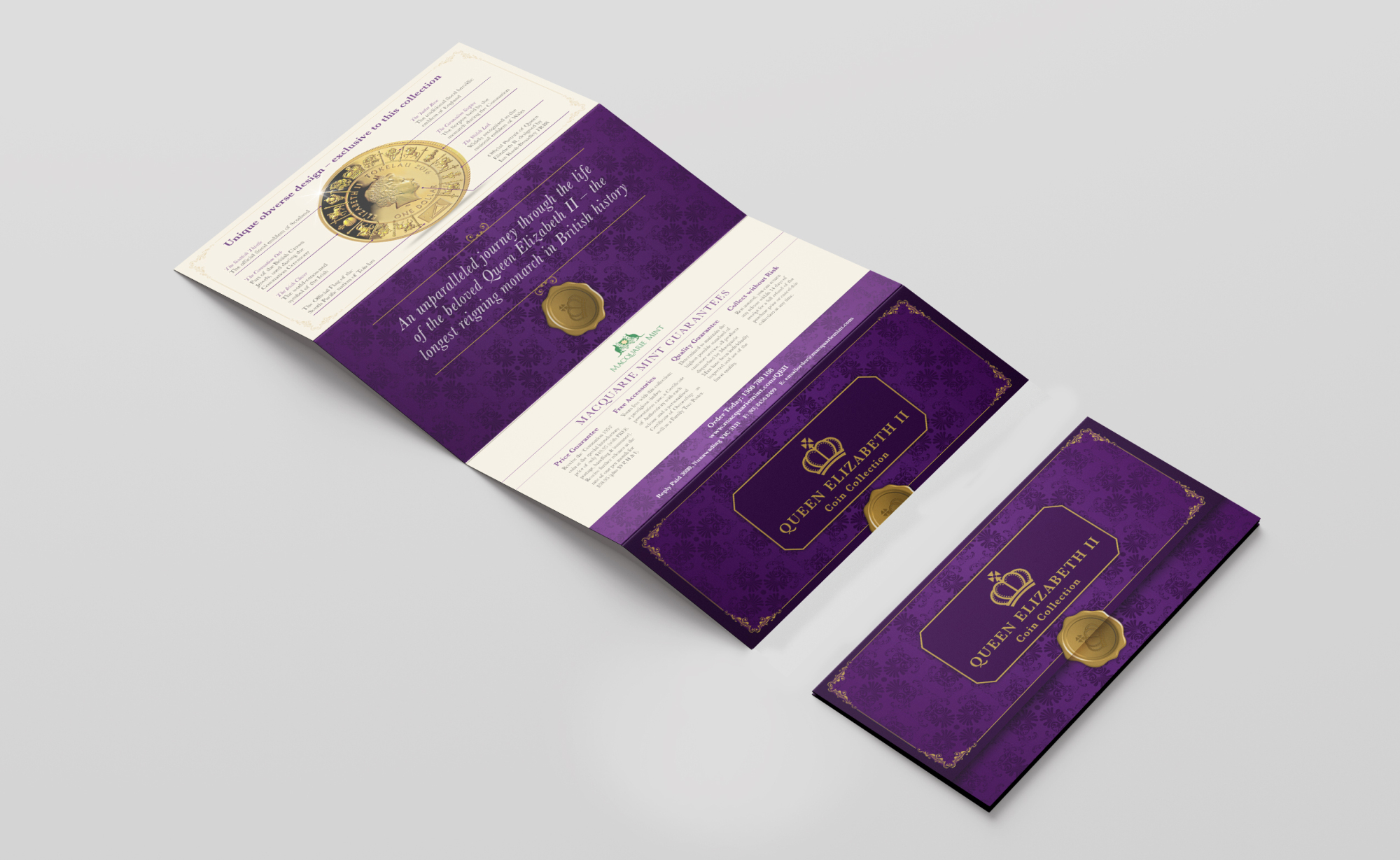 Macquarie Mint QEII Brochure Designs Macquarie Mint brochure designs promoting the Queen Elizabeth II Commemorative Coin Collection. Same concept two different formats for sales testing. Hide Content